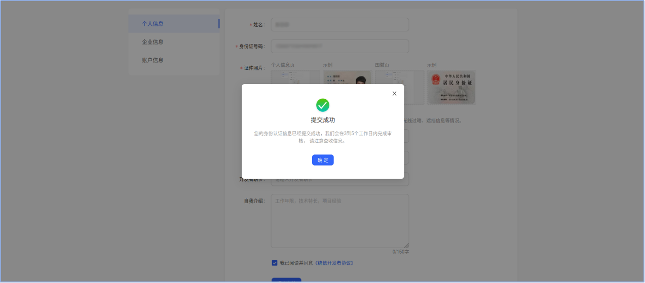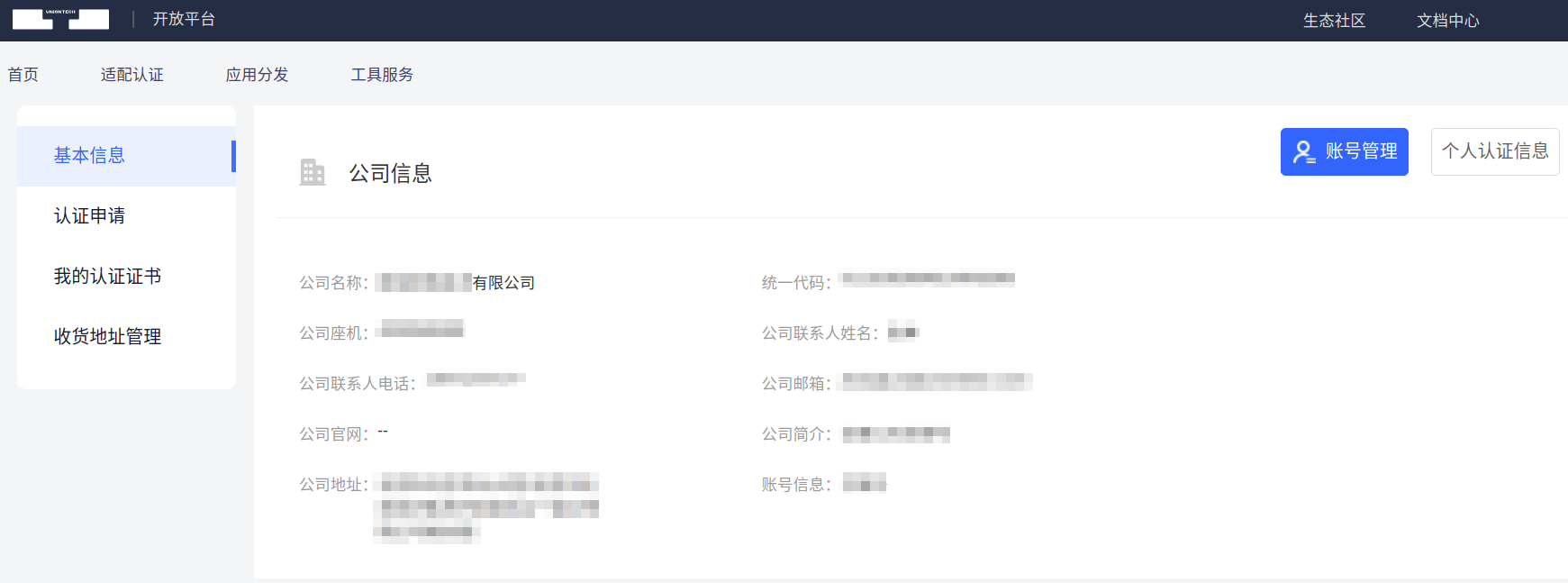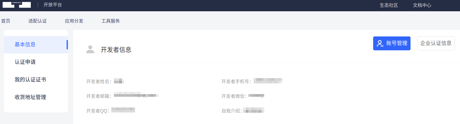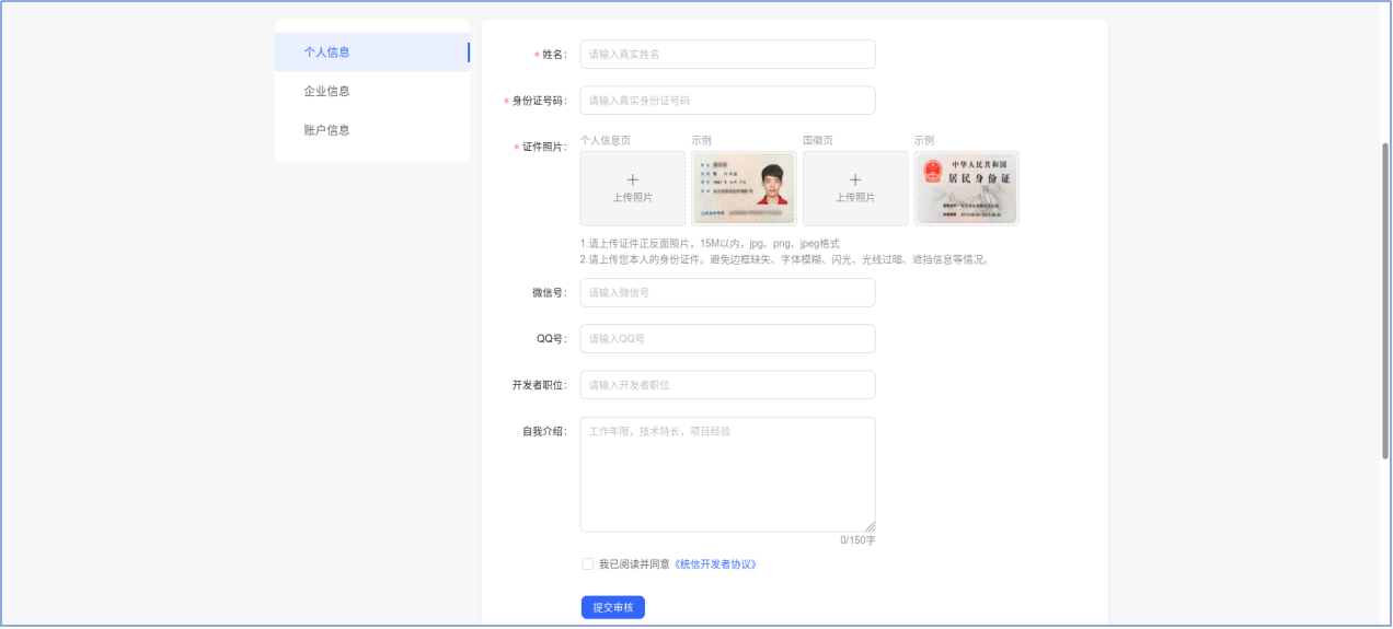 -个人认证:个人认证代表独立开发者,提交的适配申请表仅限自己查看、编辑