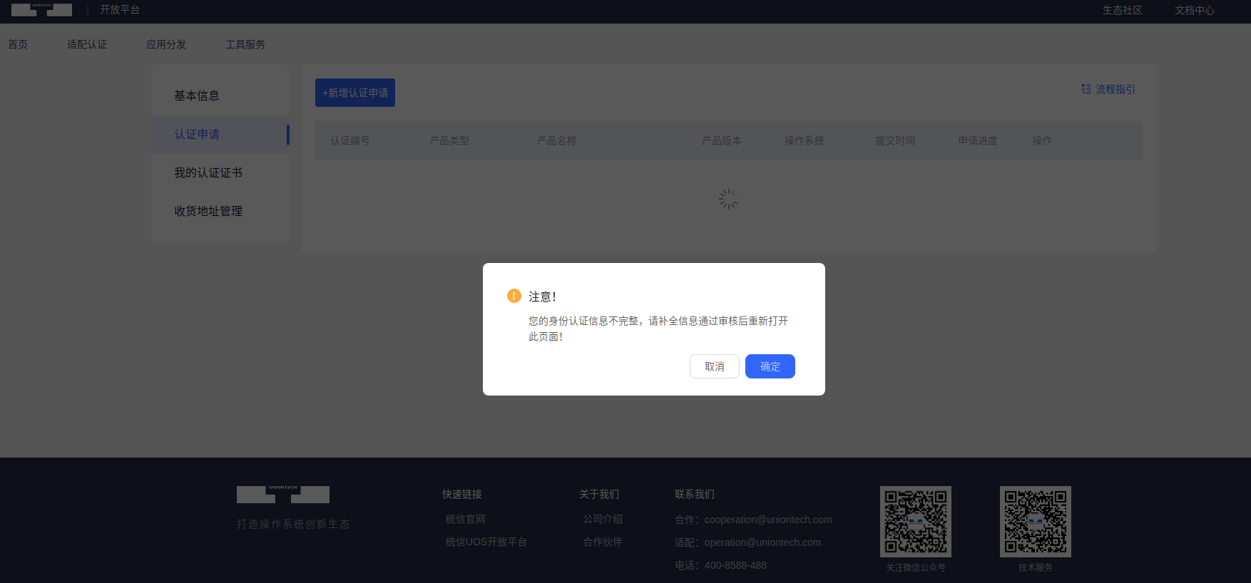 3、进入适配认证后,根据弹窗提示,点击确定跳转至统一认证平台补充认证信息。