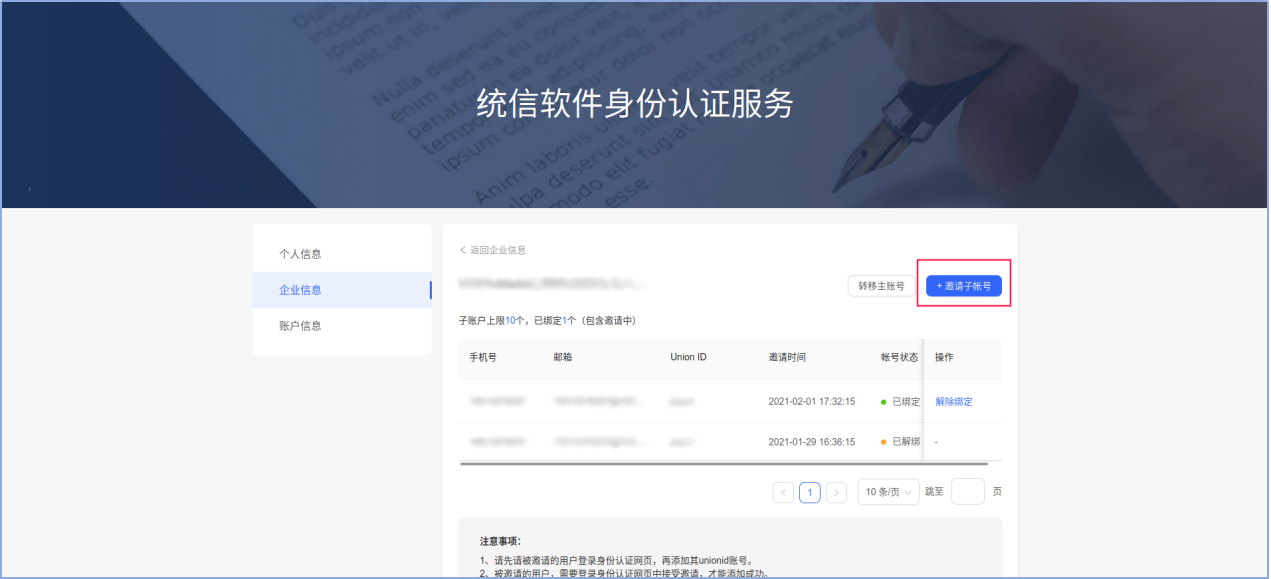 -企业认证:企业认证代表为公司,可关联10个子账号,主账号默认为该企业认证的第一个账号