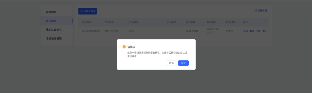 将认证在个人名下的产品转移到企业名下,收货地址同理。在企业认证状态下,该公司名下的所有子账号可互相查看、编辑提出的适配申请表,作废仅可由提出者作废。