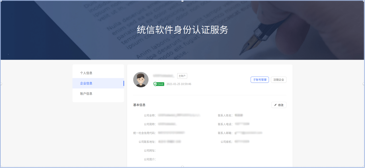 8、当企业需要添加子账号时,点击【账号管理】,再次进入认证页面,选择【企业信息】,点击【子账号管理】进行添加企业子账号