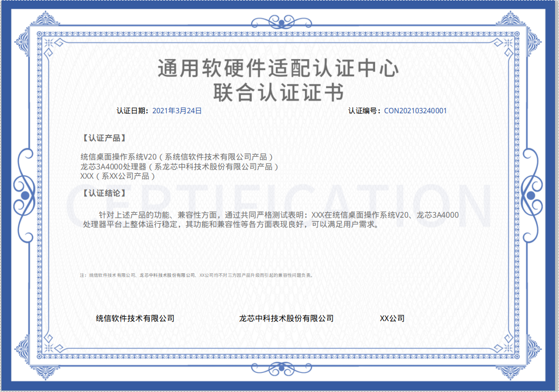 三方认证证书指统信、CPU厂商、适配产品厂商3家的产品进行适配所出具的证书。
