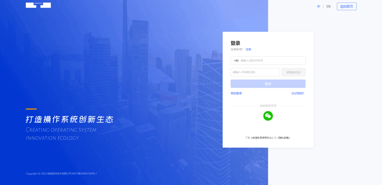 在浏览器中输入统信UOS生态社区网址(https://www.chinauos.com/) 单击右上角的【登录】按钮;或者直接输入开发者中心网址(https://identity.chinauos.com) 进入登录页面。